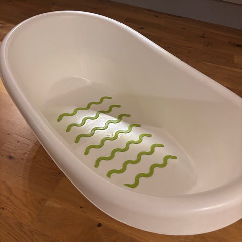 Støtte til badekar eller badebalje, for nyfødt og fram til noen månder. Det er sugekopper under.