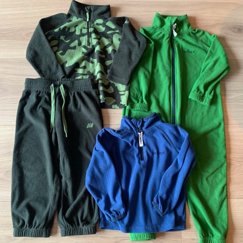 Selger pent brukte fleeceklær som kun er brukt av ett barn. 4 jakker og 6 bukser i forskjellige farger, som vist på bilde i str. 110