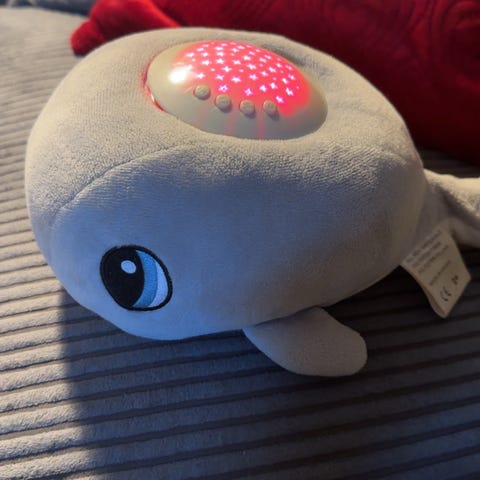 Nydelig nattlampe til den minste. Spiller beroligende musikk og lyser opp fin nattehimmel i farger.