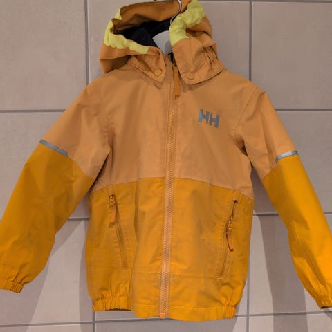 Helly Hansen Kids jakke i størrelse 128, gul farge med oransje detaljer. Jakken har hette og glidelås foran. Materialet er designet for å være slitesterkt og egnet for barn.