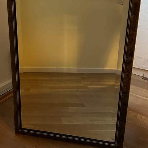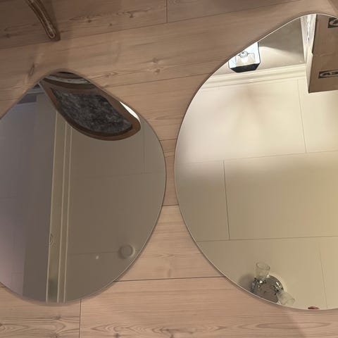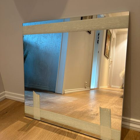 Pent gulvstående speil i blank hvit med ornamentering rundt ramme. Butikk pris var 1990 kroner.