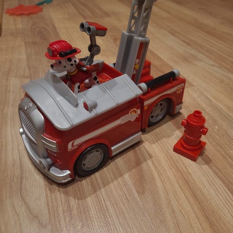 Paw Patrol brannbil med tilhørende lekefigurer og leketelefon. Inneholder to kjøretøy og to figurer fra Paw Patrol-serien. Egnet for barn som liker rollelek med brannbiltema.