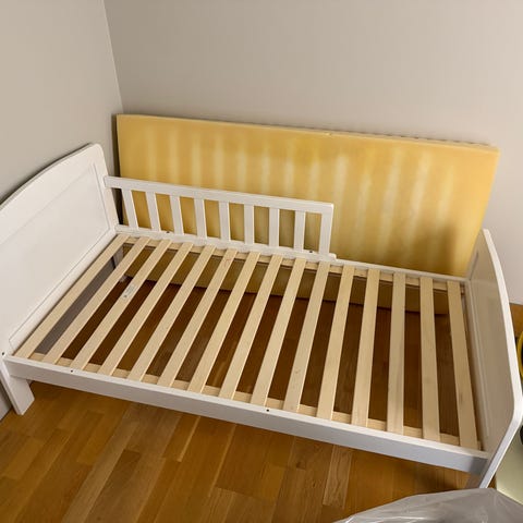 Følger med madrass og laken om man ønsker. Selges billig pga synlige "gnage" merker.
