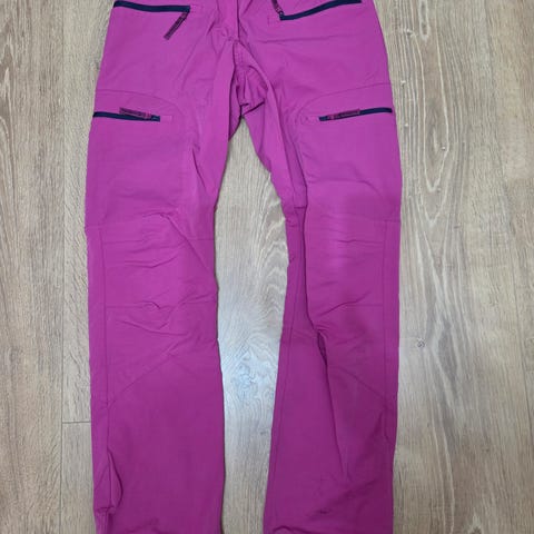 Ubrukt Skogstad bukse - 38 - selges kr 250. Romslig i størrelse. Dyp burgunder rød /lilla farge. Tapede glidelås i fresh oransje detaljer. Finner ikke oppgitt vannsøyle men virker både vind og vanntett. Lufting i lår og borrelås i midje for tilpasset størrelse.