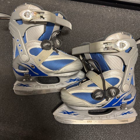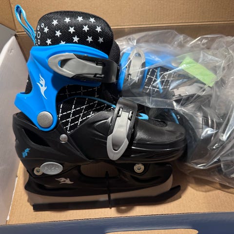 Pro Flyer justerbare barneskøyter selges. Dette er allsidige fritidsskøyter som passer til lek og moro på isen. De har kun blitt brukt en håndfull ganger.