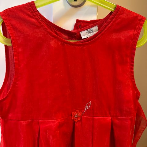Rød kjole med påsydd hjerte og lommer. Hette med for. Lange ermer.