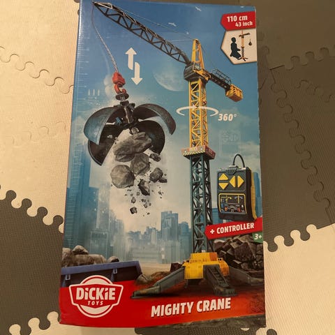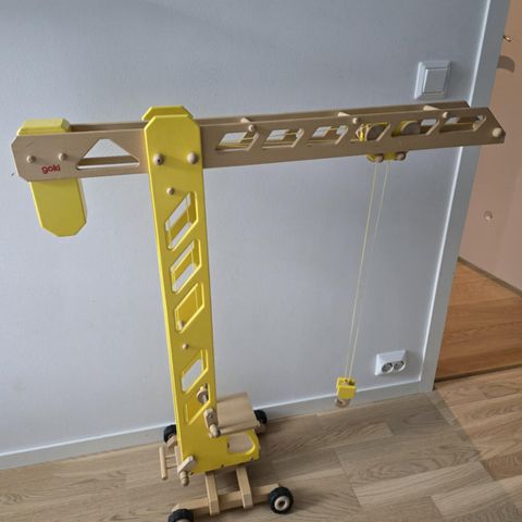 Kul og solid treheisekran fra merket Goki. Leken er 1 meter høy. Heisekranen er lite brukt og fremstår som ny, en pinne på baksiden som holder kranen oppe. Pt så har vi brukt en bambuspinne i istedenfor. Leken fungerer fint med den, men kan med fordel finne en bedre løsning. Heisekranen selges derfor billig.