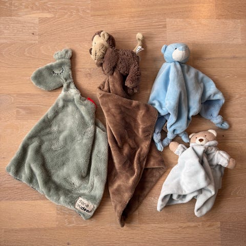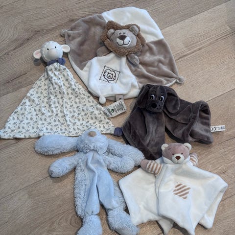 Pent og lite brukt kosekluter og en babybok. Alt er nyvasket og klart for neste barn. Den stripene er noe brukt, de andre har knapt vært i bruk.