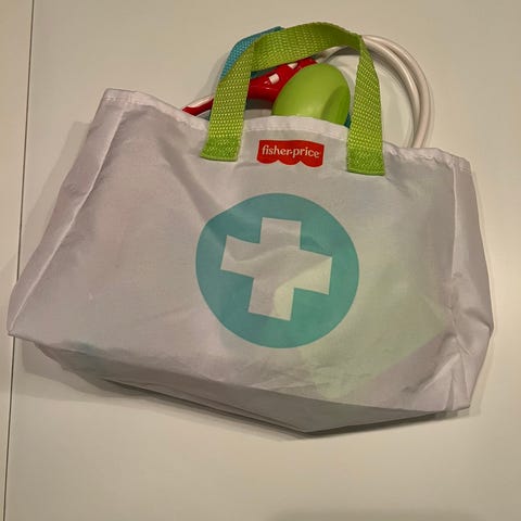 Helt ubrukt sekk og leke verktøyskasse med Oliver på, selges da vi fikk dobbelt opp i dåpsgave..