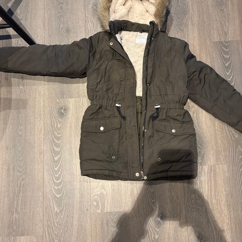 Jakke i størrelse 158 for jenter. Jakken er grønn og laget av polyester. Den har en hette med fuskepels og flere lommer. Jakken er designet for barn og gir beskyttelse mot kaldt vær.