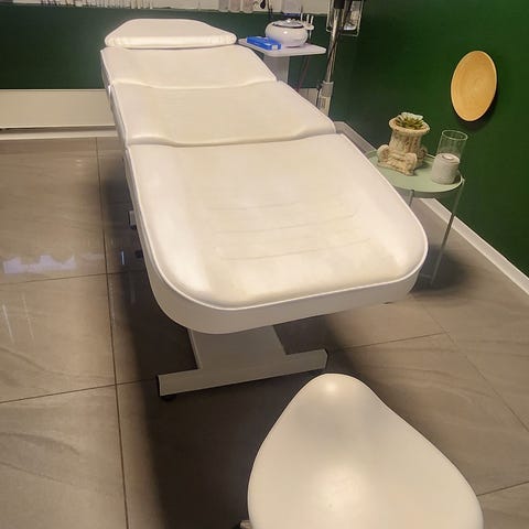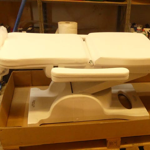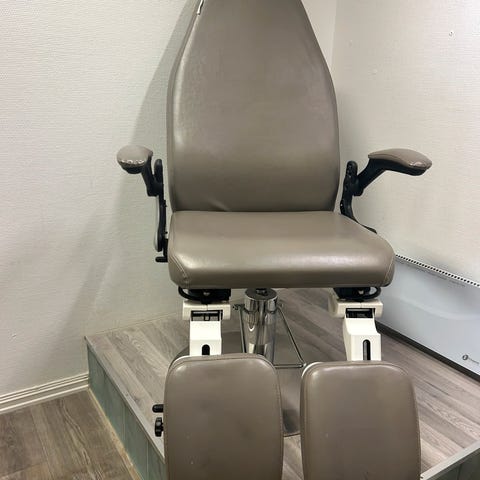 Behandlingsstol med justerbar rygg. Det er en feil slik at kun en av benene kan justeres opp, mulig det er noe som kan fikses.