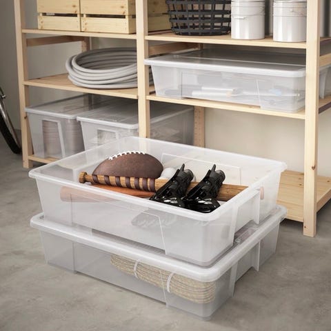IKEA oppbevaringsboks med hvit overflate og treinnsats. Passer for oppbevaring av små gjenstander som f.eks. sminke. Har plass til en bærbar pc under