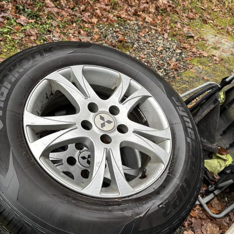 1 dekk er slitt på ytterkant i mønsteret der er det ca 5mm