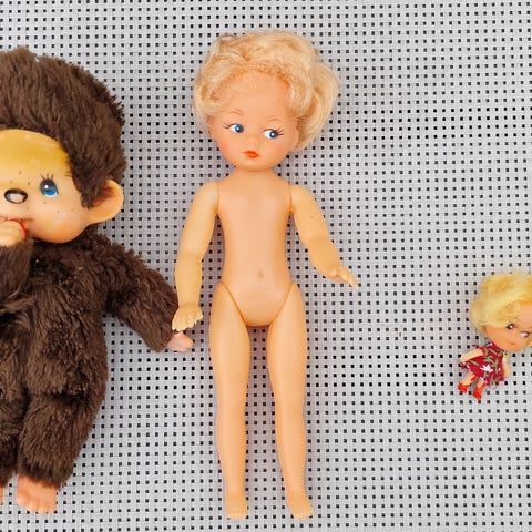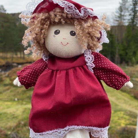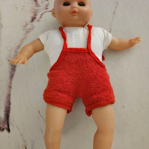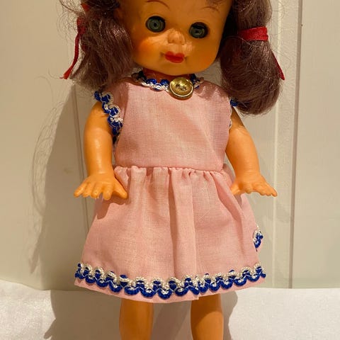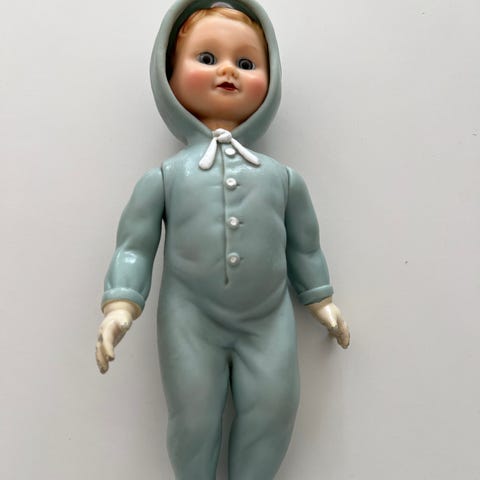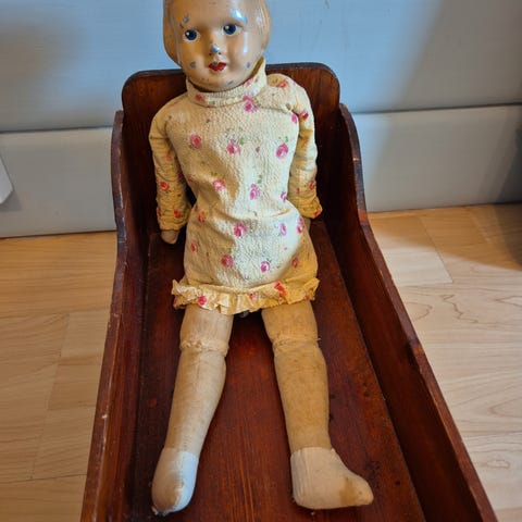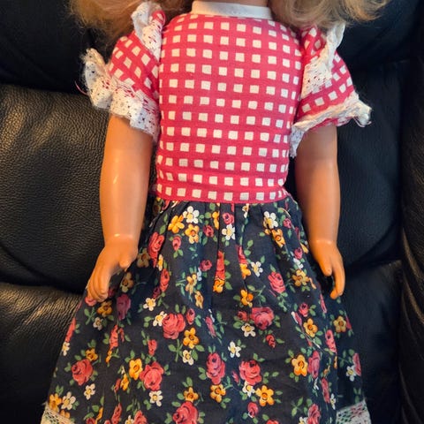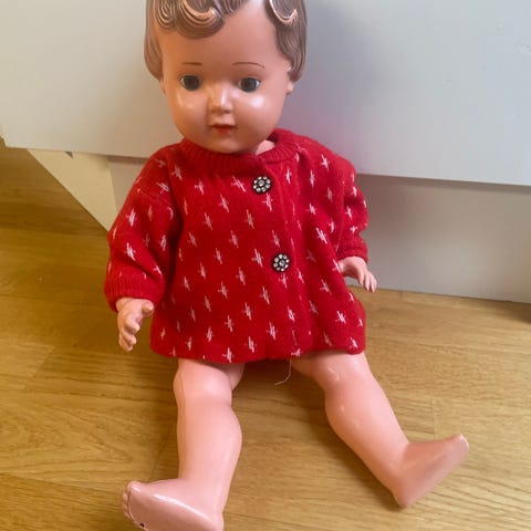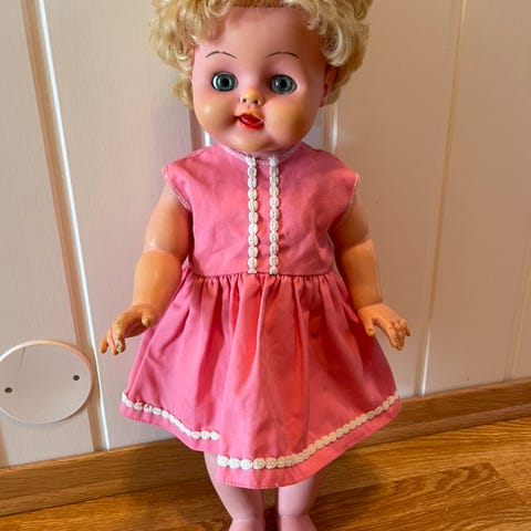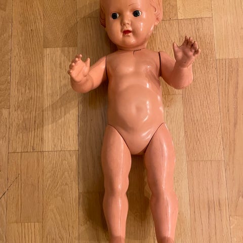 Norsk produsert dukke fra Drøbak på 60 tallet med lys hudfarge og blondt hår. Dukken er bar og har bevegelige armer og ben. 40 cm høy