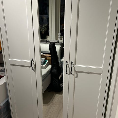 Garderoben virker brukt og hverdagslig, ikke stylet eller ryddet for bilde – mer som en vanlig klesskap i daglig bruk.