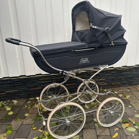 Selger med tungt hjerte Simo Classic barnevogn blå og metallramme. Barnevognen har et tradisjonelt design med store hjul og et nettingrom under for oppbevaring. Sender ikke, kan møtes i nærområdet