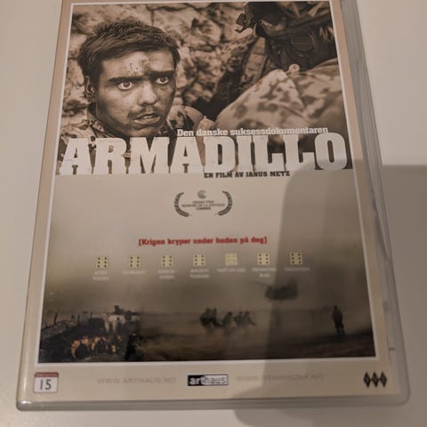 Armadillo DVD film fra 2010 med en spilletid på 1 time og 33 minutter. Filmen er en dokumentar som følger danske soldater i Afghanistan, og den er produsert av Janus Metz. Språk: Dansk, Engelsk, Norsk, Svensk, Finsk. Tekster: Dansk, Engelsk, Norsk, Svensk, Finsk. Filmformat: Widescreen.