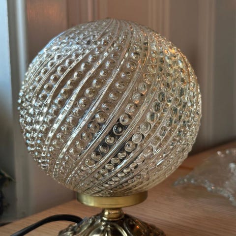 Vakker og dekorativ messinglampe med en rødlilla glasskuppel. Perfekt til å skape en lun og stemningsfull belysning. Kan brukes med både telys og kubbelys. Lampen har et elegant design med en solid messingfot og en nydelig grønn kuppel som gir et varmt og koselig lys. Passer perfekt i en vintage-inspirert innredning. Se bilder for mål. ✨