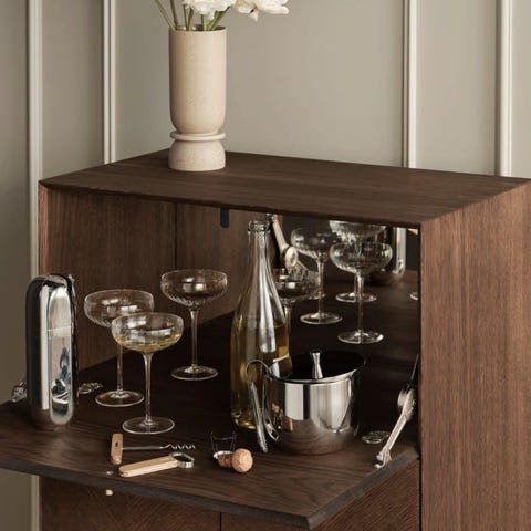 Vogue mediabenk fra Decotique med en ramme med to skyvedører og fem messing ben med en 18,5 cm høyde.