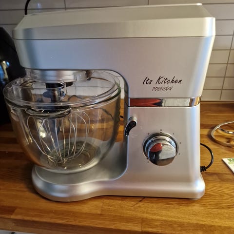 Div utstyr: 3 skiver med ulike hullstørrelser, utstyr for laging av pølse, matebrett m.m.