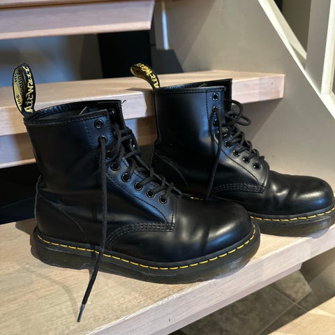 Selger et par nesten helt nye, veganske Dr. Martens boots, str 40. Brukt en gang ute, men passet ikke min fot dessverre. Kostet 1999 kr nye på Grensen sko, Oslo. Har kvittering.