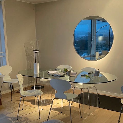 Vi flyttet inn i ny leilighet for halvannet år siden og har ikke fått brukt bordet siden. Vi håper derfor dette bordet kan få et nytt hjem. Bordet kan heves og senkes med en spak og utvides med to innleggsplater, som ligger i bordet når de ikke er i bruk.