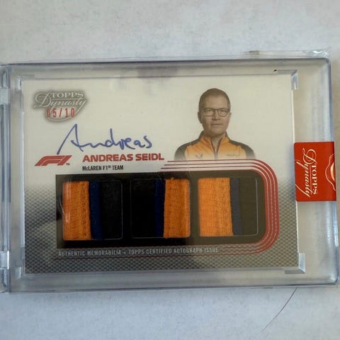 Nicholas Latifi 2020 Topps Dynasty Formel 1 racingkort med autograf og tre stoffbiter fra racingdrakten. Kortet er innkapslet og sertifisert av PSA for autentisitet. Kortet er en del av Dynasty Triple Relic-serien.