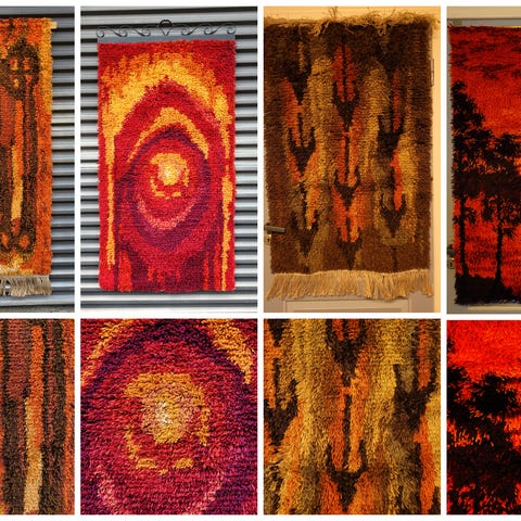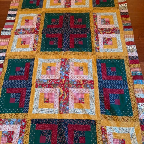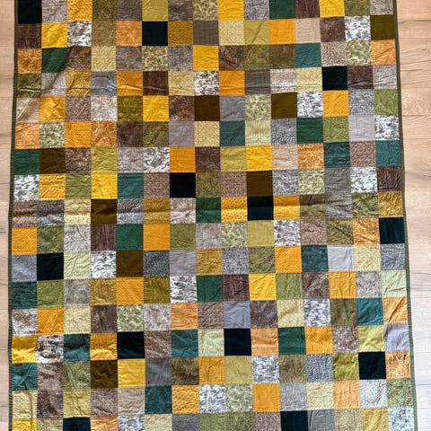Ubrukt hjemmelaget lappeteppe med fleece-bakside. Alle rutene er quiltet fast.
