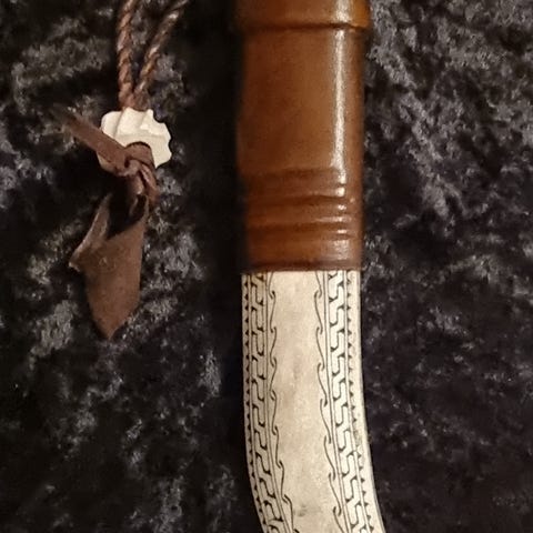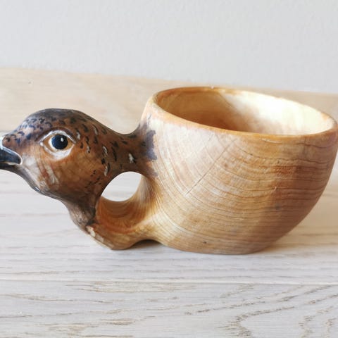 Alle koppemnene, som kommer fra riknuter på bjørk eller gråor, bli først kokt 1-2 timer. Dette for å unngå at de sprekker når man har varmt/kokende drikke i dem. Deretter grovformer jeg emnene, før jeg tørker dem i mikrbølgeovnen. De blir så formet og pusset til de har den ønskede formen. Tilslutt ligger de i rapsolje 3-4 døgn, før de legges på ei rist inntil de er helt tørr. Kan desverre ikke bruke "FiksFerdig", da jeg i så fall må kjøre 10 mil. Sender med Posten, til kr 73,- for denne koppen. Denne koppen tar 3 dl helt full.
