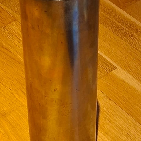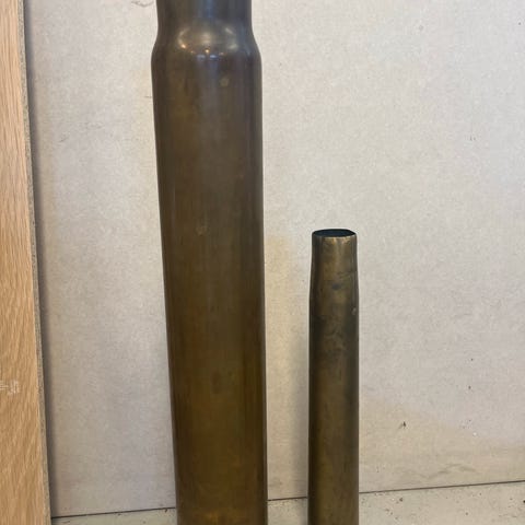 Selger to originale 105 mm NATO artillerihylser i messing, produsert rundt 1980 (LOT 2-P-80, NM 102, AN-merking).