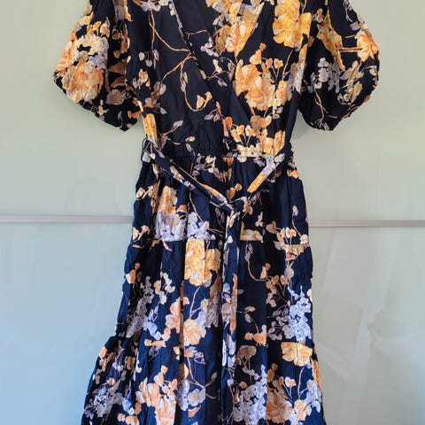 Kjole fra Culture. Blomstrete i flotte farger. Ballongermer med strikk, volanger i skjørt og belte i livet .