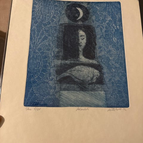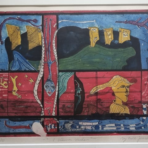 Kult og melankolsk kunstverk av Ulf Valde Jensen. Nummerert og signert. Mål bilde 22 x 51, mål med ramme 40 x 71. Profesjonelt innrammet, rammen er i tre med vakker gull-lasering.
