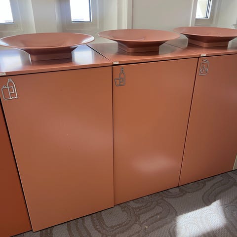 Modulbasert oppbevaringsenhet med hjul i lyst tre og hvite skuffer
