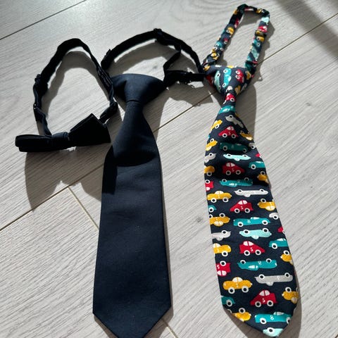 De to blå slipsene er fra Polarn & Pyret, i bomull. Kr 50 pr stk. De er 28 og 22 cm lange.