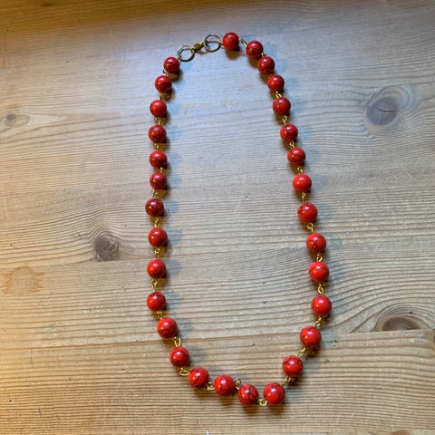 Til salgs er fint halskjede laget av naturlig eple svampkorall. Låsen og avstandperler er gullbelagt. Info om størrelse og vekt på bildene. Hvis du lurer på noen skriv melding.