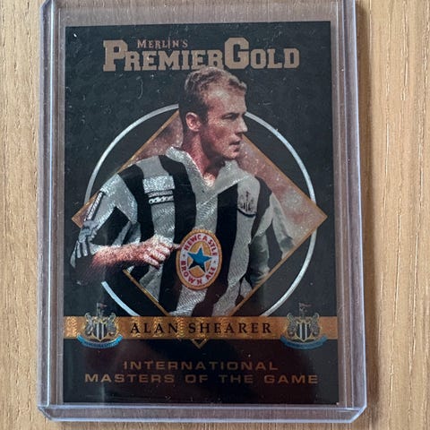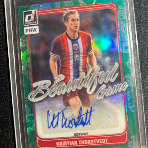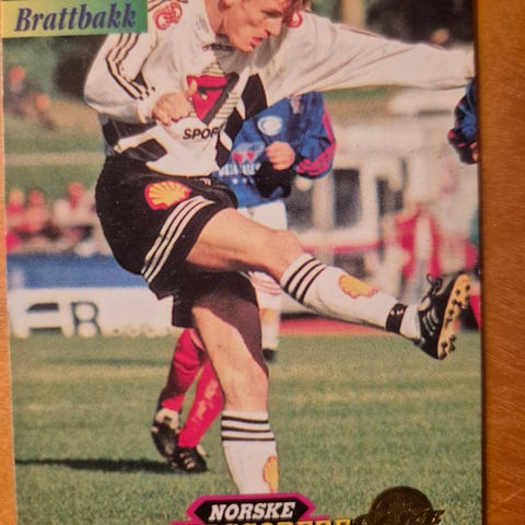 Samling av fotballkort med ulike spillere fra det norske landslaget. unike nummereringer og ett med signering