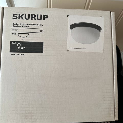 Taklampe fra Ikea, type Skurup, selges. Ingen skade el merker på den. Helt fin. Str diameter 38 cm, høyde 32. Komplett med oppheng.