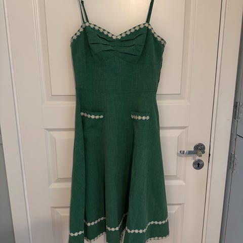 Meget pen kjole fra Voodoo Vixen. Polyester. Ikke foret. I meget bra stand. Glidelås bak. Størrelse XL, men sjekk målene. Ikke elastisk. Innsvinget. Lengde fra overkant skulder til skjørtekant ca 108 cm. Omkrets under armene ca 94 cm, liv ca 80 cm. Billigste porto. Se også mine øvrige annonser.