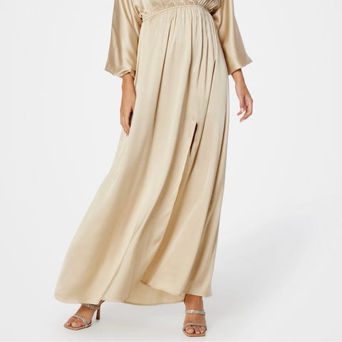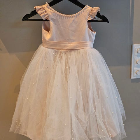 Vakker, glitrende gullkjole med tyll og silkebånd