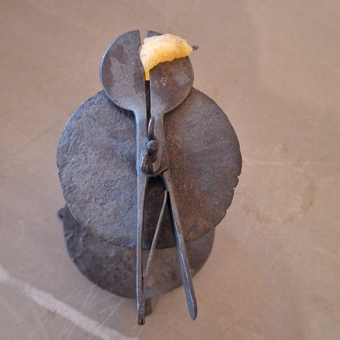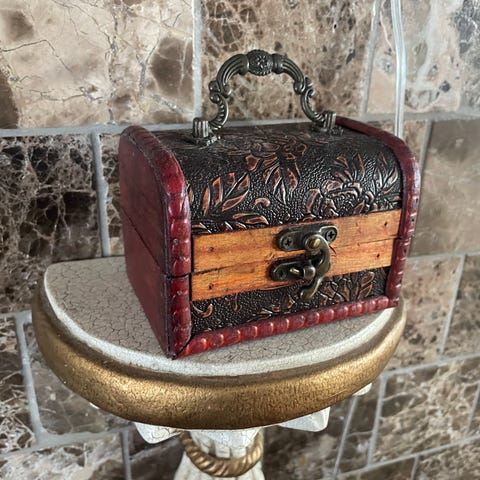 Gammelt antikt treskrin med tinnbeslag. Kan ha vært et skrin for sigarer. Måler ca 15 x 25 x 10 cm. Tinnbeslaget er noe slitt, og det kan se ut som om det er kobber kjerne. Defekt lås. Isbjørnmotiv på låsen. Mangler ene listen på sokkelen høyre side, pluss en liten skade i treverket. Ellers helt og fint.