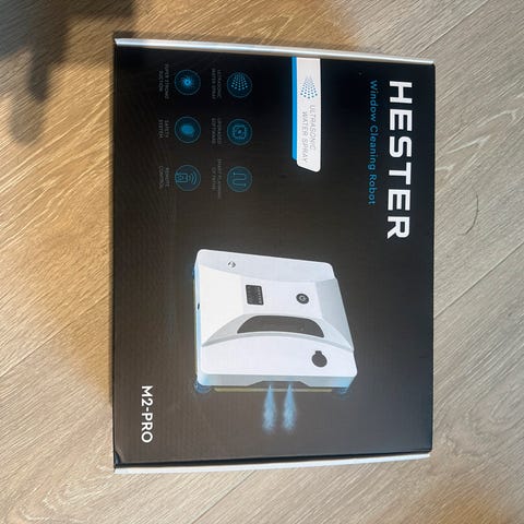 Hester M2 Pro vindusvasker med automatisk funksjon. Produktet er hvitt og designet for effektiv rengjøring av vinduer. Leveres med fjernkontroll for enkel betjening og ulike rengjøringsmoduser.