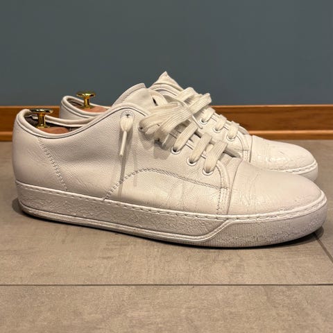 Selger et par klassiske Lanvin Cap Toe sneakers i grått semsket skinn (suede) med glanset tå (patent leather) – den ikoniske modellen som startet hele “designer sneaker”-trenden 🔥