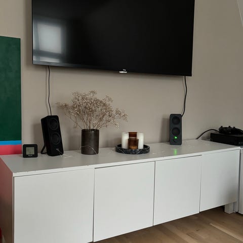 Er laget hull til diverse ledninger bak, er ikke synlig. Er mulig å henge den opp, men oppheng følger ikke med men er mulig å kjøpe hos forhandler. Den ene skuffen er i mesh-stoff for bedre signal til tv-bokser, bedre lyd på evt lydplanke etc.