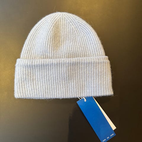 Selger lue fra Samsøe Samsøe i fargen misty blue. Laget av ullmateriale, og har en ribbestrikket tekstur og oppbrettkant. Aldri brukt, men tatt av lappen