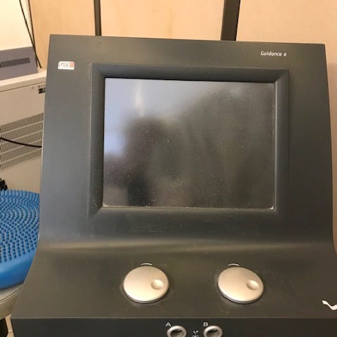 Healy Resonance med Coil. Elektronisk terapiapparat med tilbehør som armbånd, elektroder, brukermanual og ladekabler. Enheten er designet for personlig bruk og inkluderer flere komponenter for terapi og helseovervåkning. Den har fokus på frekvensbehandling.