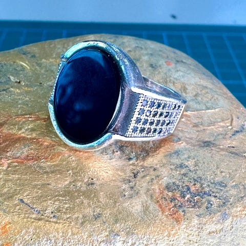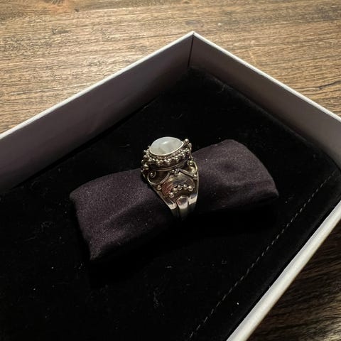 Vakker ring i sølv med fem månesteiner. Str 54. Kan med fordel få en sølvpuss. Kommer i tilfeldig smykkeeske.