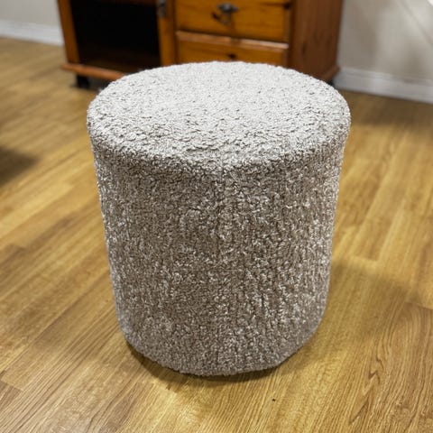 Selger en pen og funksjonell puff/krakk med mykt, rundt sete i varm senneps-/beigefarge. Solid svart metallunderstell gir god stabilitet. Passer perfekt som ekstra sitteplass, fotskammel eller dekorativt element i stue, soverom eller gang.