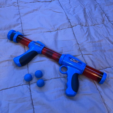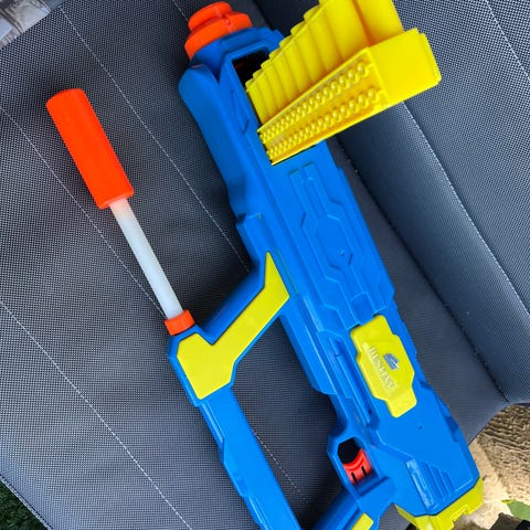 Den hvite og grønne skumblasteren er identifisert som en Eddy Toys Shooter leketøypistol som bruker skumgummipilerFølger med 10 skumpiler, ligger i kammeret.
