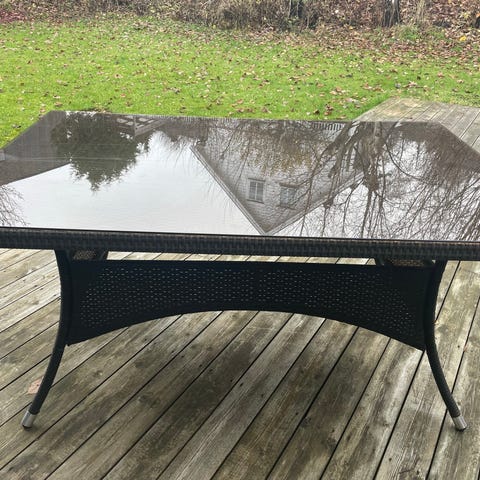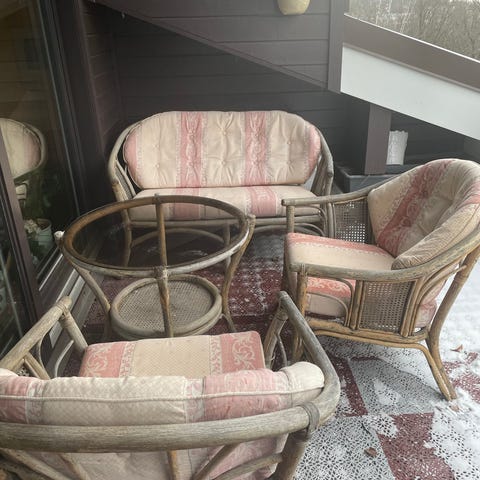 Utemøbelsett bestående av et rundt bord med glassplate og tre metallstoler. Bordet har en ramme i flettet materiale, og stolene har dekorative ryggstøtter. Må hentes i Ringveien 66A, Nittedal