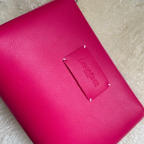 Lancome sminkveske i blå farge med hvite prikker. Vesken har glidelås og er laget i stoffmateriale. Egnet for oppbevaring av sminke og små personlige eiendeler.